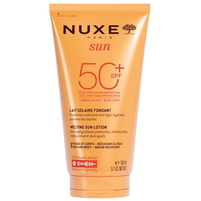 Lozione solare SPF50+ a protezione molto alta con una texture fondente che protegge dai raggi UVA/UVB e dalla luce blu, idrata in profondità e previene le macchie scure.