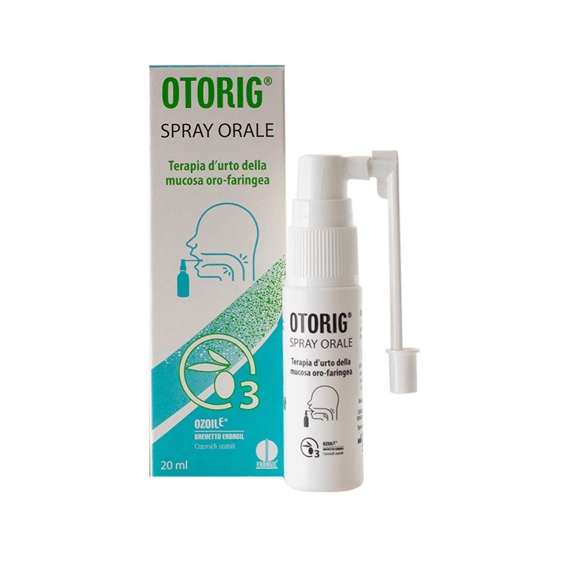 Dispositivo medico specifico per la prevenzione e il trattamento delle affezioni della mucosa oro-faringea sia in fase acuta che cronica. Crea un film lipidico protettivo contro aggressioni esterne e fattori ambientali avversi generando un ambiente ostile alle alterazioni del microbiota. Otorig spray orale è indicato in tutte quelle situazioni a carico di bocca, gengive, gola, caratterizzate da forte irritazione, gonfiore, bruciore, prurito, difficoltà nella deglutizione, stress ossidativo di varia eziologia, coadiuvante in caso di raucedine e tosse di varia natura, sindromi influenzali o da raffreddamento, postumi operatori in ORL. Formulazione innovativa con Ozoile, Otorig spray orale crea una barriera protettiva che dona sollievo immediato, preserva il microbiota e ripristina il buono stato delle mucose del cavo orale.