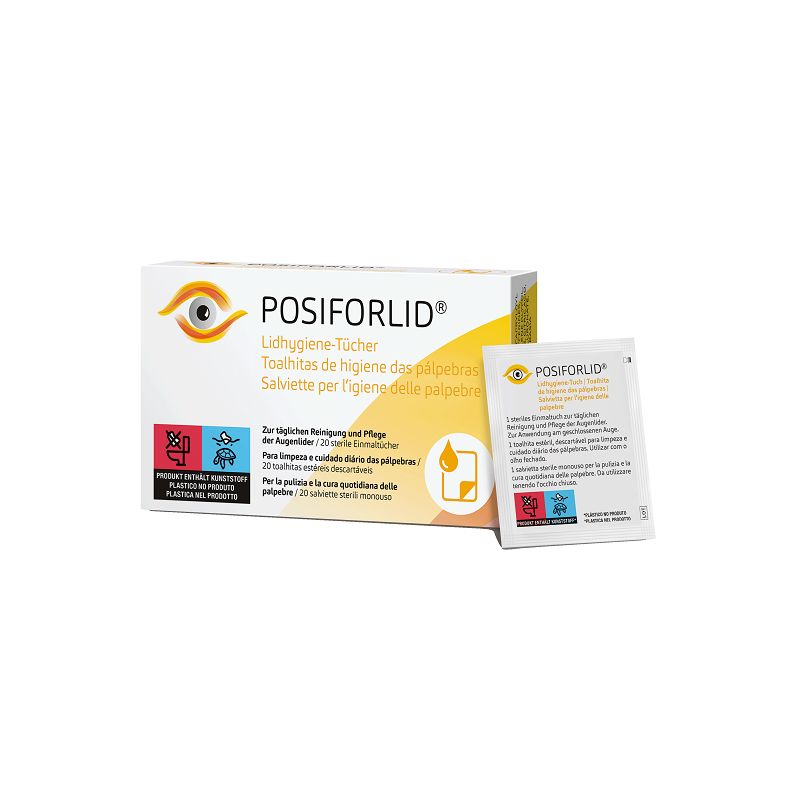 Descrizione Le salviette per l'igiene delle palpebre Posiforlid sono salviette sterili, monouso e umidificate, particolarmente indicate per la pulizia e la cura quotidiana delle palpebre sensibili. Le salviette per l'igiene delle palpebre Posiforlid imbevute di sodio ialuronato, equiseto ed eufrasia aiutano a pulire delicatamente e curare la pelle sensibile delle palpebre. Contemporaneamente permettono di eliminare con delicatezza eventuali depositi (ad es. crosticine, polvere, pollini) formatasi sulle palpebre e/o fra le ciglia. Le salviette per l'igiene Posiforlid sono quindi indicate per apportare sollievo alle infiammazioni dei margini palpebrali.