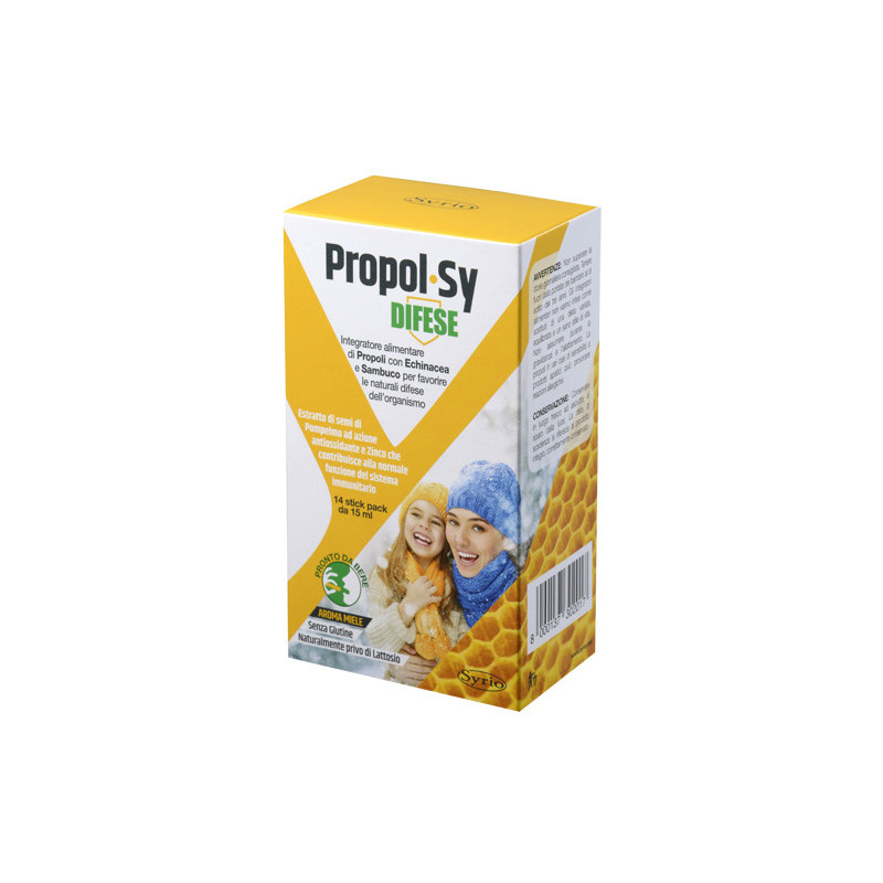 Descrizione Propol-Sy DIFESE è un integratore alimentare a base di propoli. La formulazione associa le proprietà della propoli a quelle dell'estratto secco di echinacea, che favorisce le naturali difese dell'organismo e la funzionalità delle prime vie respiratorie. I frutti di sambuco favoriscono la fluidità delle secrezioni bronchiali, la funzionalità delle prime vie respiratorie e le naturali difese dell'organismo. I semi di pompelmo hanno azione antiossidante, mentre lo zinco contribuisce alla normale funzione del sistema immunitario.
