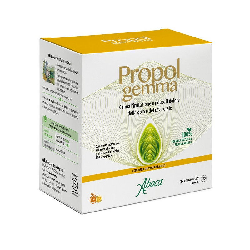 Complesso molecolare composto da resine, polisaccaridi e lignine ottenuto da gemme di pioppo nero, dalla cui resina le api ricavano la propoli europea. Grazie a un particolare processo estrattivo multifrazione, il prodotto si caratterizza per la presenza dei componenti principali tipici della propoli uniti a composti funzionali del tessuto vegetale della gemma di pioppo. Proteggendo la mucosa, calma l'irritazione e riduce il dolore della gola e del cavo orale. Il prodotto è indicato nel trattamento del mal di gola e delle affezioni del cavo orale (come stomatiti, afte e gengiviti) associati a bruciore, dolore e sensibilità alla deglutizione. Il prodotto può essere utilizzato anche come protezione preventiva, in tutti i casi in cui si è esposti ad agenti esterni offensivi o irritanti (freddo, fumo, smog). Si consiglia l'uso a partire dai 12 anni di età.