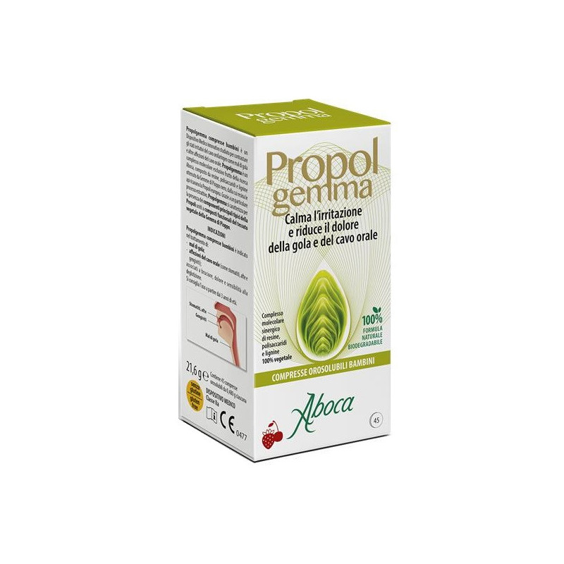 Complesso molecolare composto da resine, polisaccaridi e lignine ottenuto da gemme di pioppo nero, dalla cui resina le api ricavano la propoli europea. Grazie a un particolare processo estrattivo multifrazione, il prodotto si caratterizza per la presenza dei componenti principali tipici della propoli uniti a composti funzionali del tessuto vegetale della gemma di pioppo. Proteggendo la mucosa, calma l'irritazione e riduce il dolore della gola e del cavo orale. Il prodotto è indicato nel trattamento del mal di gola e delle affezioni del cavo orale (come stomatiti, afte e gengiviti) associati a bruciore, dolore e sensibilità alla deglutizione. Il prodotto può essere utilizzato anche come protezione preventiva, in tutti i casi in cui si è esposti ad agenti esterni offensivi o irritanti (freddo, fumo, smog). Si consiglia l'uso a partire dai 3 anni di età.