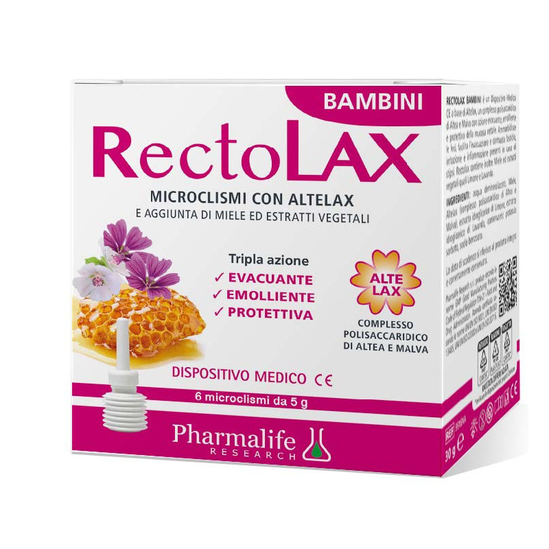 Descrizione Dispositivo Medico CE Classe I. Non sterile. A base di Altelax, un complesso polisaccaridico di Altea e Malva con azione evacuante, emolliente e protettiva della mucosa rettale. Ammorbidisce le feci, facilita l’evacuazione e contrasta fastidio, irritazione e infiammazione presenti in caso di stipsi. Rectolax contiene inoltre Miele ed estratti vegetali quali Limone e Lavanda.