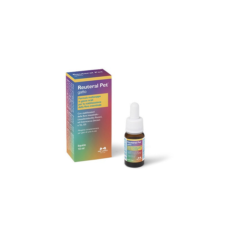 Descrizione Formula multiceppo in gocce orali per la stabilizzazione della flora intestinale. Mangime complementare per gatti di tutte le età con stabilizzatori della flora intestinale – Limosilactobacillus Reuteri, ed Enterococcus faecium e vitamina D3. angime complementare privo di derivati animali che, grazie alla sua formulazione multiceppo, contribuisce a stabilizzare la flora intestinale. Reuteral Pet gatto contiene vitamina D3, Limosilactobacillus reuteri ed Enterococcus faecium in grado di favorire il normale equilibrio della flora intestinale.