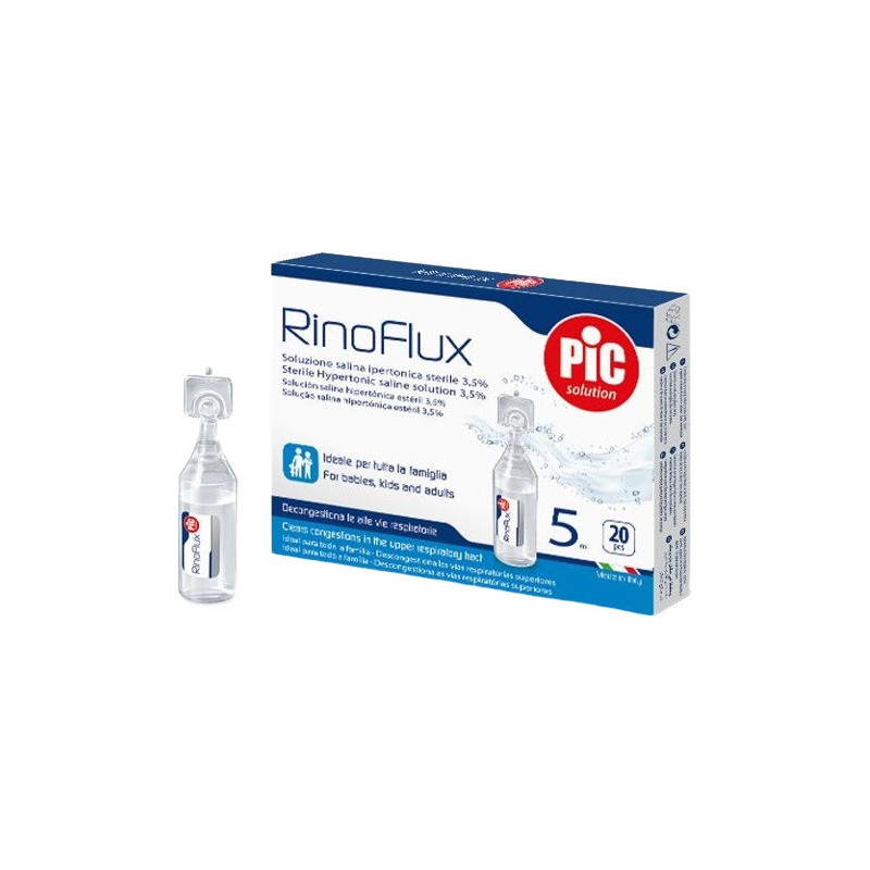 RinoFlux è disponibile in fiale monodose da 5 ml, in confezioni da 20 fiale monouso e monopaziente. La fiala è sterile e pronta all'uso, pratica da utilizzare e da tenere a portata di mano. Il prodotto è monouso, monopaziente e in fiale monodose. Si consiglia di utilizzarla in una sola volta allo scopo di mantenere inalterate le caratteristiche di sterilità.