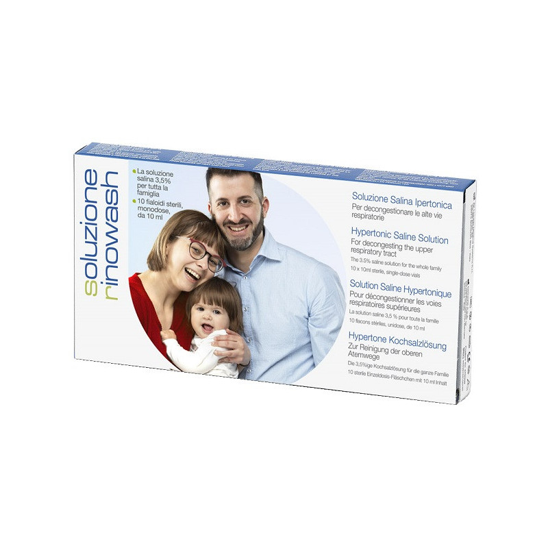 Descrizione Soluzione salina ipertonica, per decongestionare le alte vie respiratorie. - Ipertonica: soluzione salina 3,5%. - Pratica: la soluzione rinowash permette il lavaggio delle cavità nasali e le deterge. - Rapida ed efficace: la maggiore salinità della soluzione facilita la rimozione di muco, secrezioni e la decongestione nasale in caso di raffreddori, riniti e sinusiti.