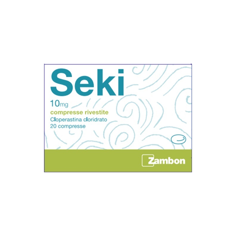 SEKI 10 mg compresse rivestite Una compressa contiene: principio attivo: cloperastina cloridrato mg 10; eccipiente con effetto noto: saccarosio 38,07 mg.SEKI 35,4 mg/ml gocce orali, sospensione 100 ml contengono: principio attivo: cloperastina fendizoato 3,54 g pari a cloperastina 1,8 g; eccipienti con effetti noti: saccarosio 14 g, metil-para-idrossibenzoato 0.2 g. 1 goccia (equivalente a 0,05 ml) contiene 1,8 mg di cloperastina fendizoato pari a 0,9 mg di cloperastina. SEKI bambini 4,4 mg compresse masticabili Una compressa contiene: principio attivo: cloperastina fendizoato mg 4,4; eccipiente con effetto noto: saccarosio 36,8 mg. Per l’elenco completo degli eccipienti, vedere paragrafo 6.1