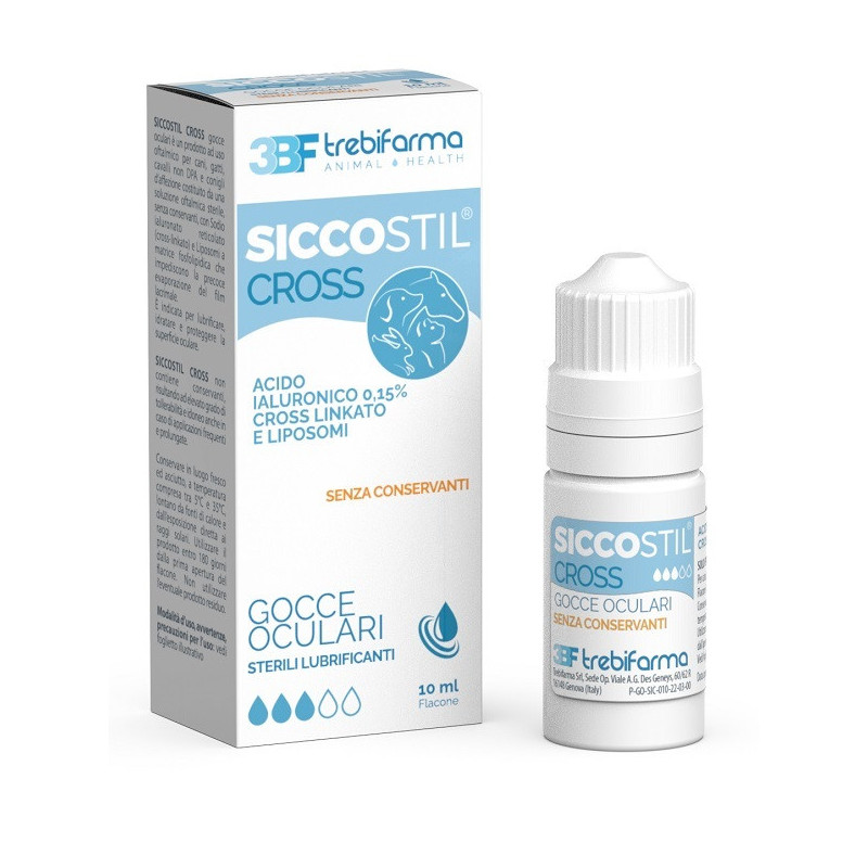 Avvertenze Uso esterno. Solo per uso veterinario. - Prodotto oftalmico per uso esterno veterinario. - Evitare di toccare l'occhio con la punta del flacone. - Non utilizzare il prodotto dopo la data di scadenza riportata sulla confezione. - Lasciar trascorrere 10-15 minuti tra l'instillazione di Siccostil Cross e l'eventuale instillazione di farmaci o prodotti per uso oftalmico esterno. - Non utilizzare in caso di ipersensibilità soggettiva o incompatibilità nota verso qualsiasi componente della preparazione. - Tenere fuori dalla vista e dalla portata dei bambini. - Non disperdere il contenitore nell’ambiente dopo l’uso.