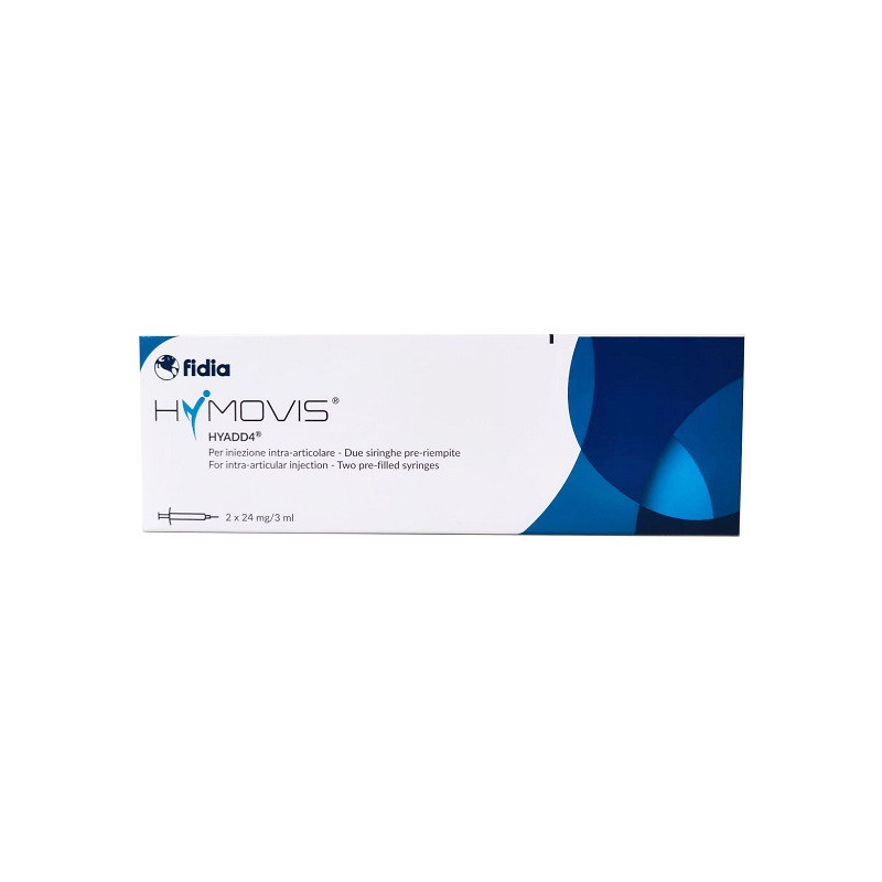 Idrogel sterile, prodotto con Hyadd4 (esadecilammide di sodio ialuronato naturale altamente purificato ottenuto da fermentazione batterica) in soluzione isotonica tamponata. Grazie all’alta viscosità ed elasticità data dall’esadecilammide di sodio ialuronato, HYMOVIS migliora la funzione lubrificante e di assorbimento degli urti del liquido sinoviale, proteggendo la cartilagine e i tessuti molli dalle lesioni meccaniche. Queste proprietà, unite alla prolungata permanenza nelle articolazioni, permettono a HYMOVIS di alleviare il dolore e di migliorare fino a sei mesi la funzione articolare nell’osteoartrosi di qualsiasi natura, lieve o moderata, dell’anca e del ginocchio.