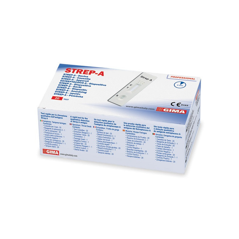 Descrizione Test rapido per il rilevamento qualitativo dell’antigene dello streptococco di gruppo A in campioni faringeo-tonsillari. Solo per uso diagnostico in vitro in ambito di analisi decentrate o professionali in laboratorio. Il test rapido per il rilevamento dello streptococco di gruppo A è un immunodosaggio cromatografico rapido per il rilevamento qualitativo dell’antigene dello streptococco di gruppo A in campioni faringeo-tonsillari. Il test rapido su strip per il rilevamento dello streptococco di gruppo A è destinato esclusivamente all’uso diagnostico in vitro in ambito di analisi decentrate o professionali in laboratorio e deve essere utilizzato come ausilio nella diagnosi delle infezioni da Streptococco di gruppo A. Il test fornisce risultati preliminari; i risultati negativi non precludono l’infezione da streptococco di gruppo A e non possono essere utilizzati come unica base per le decisioni di trattamento o di gestione. Non è adatto per l’autoanalisi. Il test rapido su strip per il rilevamento dello streptococco di gruppo A è un test immunocromatografico a flusso laterale per il rilevamento dell’antigene carboidrato dello streptococco del gruppo A in un prelievo faringeo-tonsillare. In quest’analisi, l’anticorpo specifico dell’antigene carboidrato dello streptococco di gruppo A è ricoperto sulla zona della linea di test. Durante il test, il campione faringeo-tonsillare reagisce con l’anticorpo dello streptococco di gruppo A che è ricoperto su particelle. La miscela migra fino alla membrana per reagire con l’anticorpo dello streptococco di gruppo A sulla membrana e creare una linea colorata nella zona della linea di test. La presenza di questa linea colorata nella zona della linea di test indica un risultato positivo, mentre l’assenza un risultato negativo. A scopo di controllo procedurale, comparirà sempre una riga colorata nella zona di controllo, ad indicare che è stata versata una quantità corretta di campione e che la membrana è stata imbevuta.