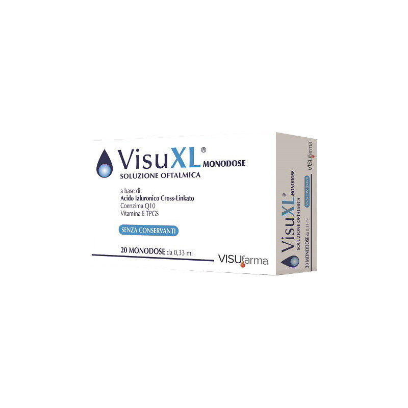 Descrizione Soluzione oftalmica lubrificante e antiossidante senza conservanti a base di coenzima Q10, vitamina E TPGS e acido ialuronico sale sodico cross-linkato. L’acido ialuronico cross-linkato è una forma di acido ialuronico più stabile ed efficace rispetto alla forma non stabilizzata che conferisce a VisuXL migliori proprietà viscoelastiche, mucomimetiche e idratanti ed una efficacia maggiore nel tempo. La combinazione di acido ialuronico cross-linkato e sostanze antiossidanti/antiradicali permette un trattamento più efficace nei casi di: - secchezza oculare; - alterazioni della continuità della superficie corneale e congiuntivale dopo chirurgia refrattiva, trauma da corpo estraneo e interventi chirurgici; - alterazioni della superficie oculare legate a patologie metaboliche (diabete); - stress ambientale (smog, acqua clorata, microclimi alterati, fumo, aria condizionata); - intensa e prolungata esposizione a radiazioni UV e ionizzanti; - uso prolungato di computer, videoterminali, televisione.