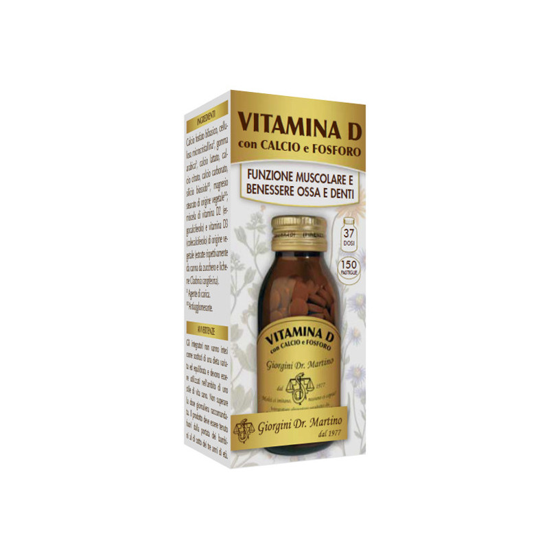 Descrizione Integratore alimentare con calcio, fosforo e vitamina D, utili principalmente per favorire il normale mantenimento di ossa e denti. La vitamina D promuove l'assorbimento e l'utilizzo di calcio e fosforo e coadiuva la normale funzione del sistema immunitario; insieme al calcio, contribuisce al mantenimento della funzione muscolare e interviene nei processi di divisione delle cellule. Il calcio, inoltre, contribuisce alla normale neurotrasmissione e coagulazione del sangue e, insieme al fosforo, sostiene il metabolismo energetico. Non contiene conservanti, coloranti, aromi ed edulcoranti di sintesi. Prodotto adatto ai vegani.