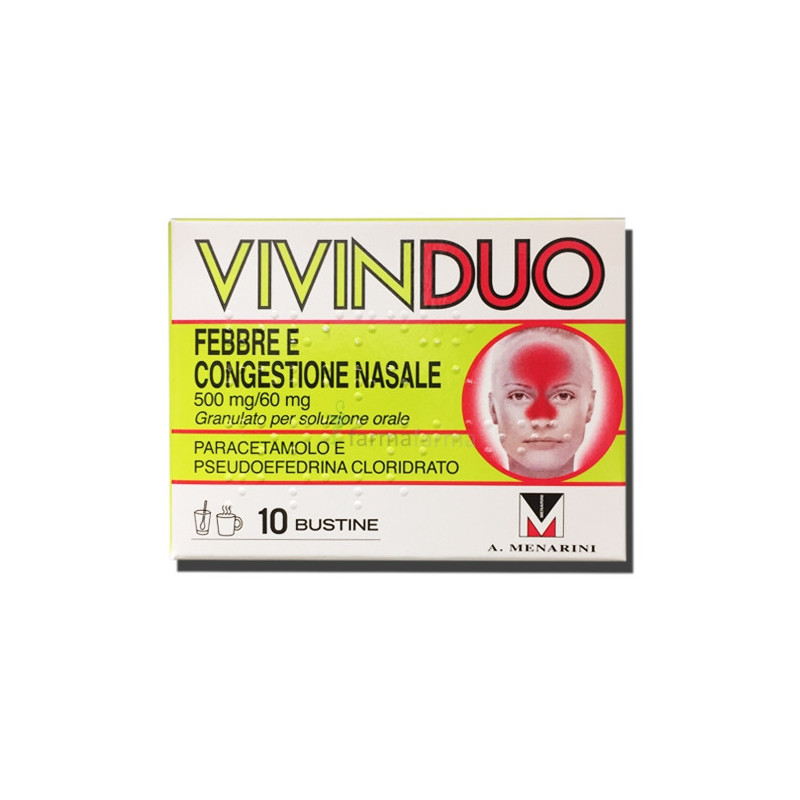 Posologia Adulti e ragazzi al di sopra dei 12 anni di età: 2-3 bustine al giorno, disciolte in un bicchiere d'acqua. Bambini: non è raccomandato nei bambini al di sotto dei 12 anni (vedere paragrafo 4.3). Utilizzare la dose minima efficace. Iniziare, cioè, il trattamento al dosaggio minimo previsto aumentando la dose solo se i sintomi non sono sufficientemente controllati. La dose massima (sia per singola somministrazione sia per dose giornaliera totale) non deve mai essere superata. Negli adolescenti, negli anziani o nei soggetti con funzione epatica o renale compromessa può essere necessario ridurre il dosaggio in rapporto alle condizioni cliniche del paziente; in questi casi il paziente deve essere avvertito di consultare il medico prima di usare VIVINDUO FEBBRE E CONGESTIONE NASALE. Il medicinale deve essere utilizzato: 5 giorni massimo di terapia per la popolazione adulta; 3 giorni massimo di terapia per la popolazione pediatrica (12-18 anni). Modo di somministrazione Sciogliere il granulato in un bicchiere di acqua e bere immediatamente la soluzione ottenuta. È possibile utilizzare anche acqua calda.
