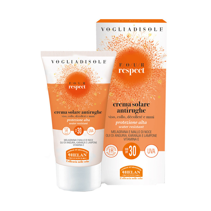 Crema solare antirughe con fattore di protezione alto, previene i danni del sole con un sistema filtrante efficiente, fotostabile e rispettoso della biodiversità marina, non solo per evitare le scottature (UVB) ma anche per ridurre il rischio di un precoce invecchiamento cutaneo (UVA).